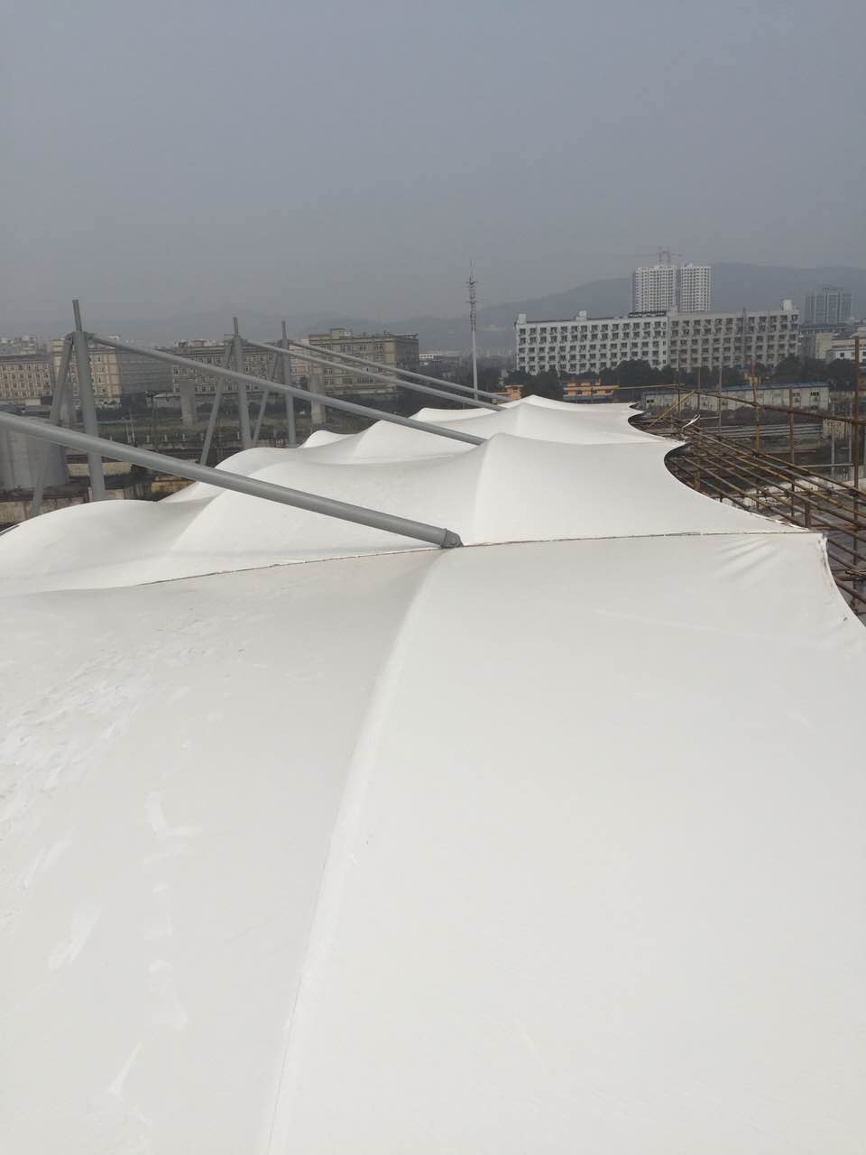 以膜材、鋼索及支柱構(gòu)成,利用鋼索與支柱在膜材中導(dǎo)入張力以達(dá)安 定的形式。除了可實踐具創(chuàng)意,創(chuàng)新且美觀的造型外,也是最能展現(xiàn)膜結(jié) 構(gòu)精神的構(gòu)造形式. 近年來,大型跨距空間也多采用以鋼索與壓縮材構(gòu)成鋼索網(wǎng)來支撐上部膜材的形式。因施工精度要求高,結(jié)構(gòu)性能強(qiáng),且具豐 富的表現(xiàn)力,所以造價略高于骨架式膜結(jié)構(gòu)。